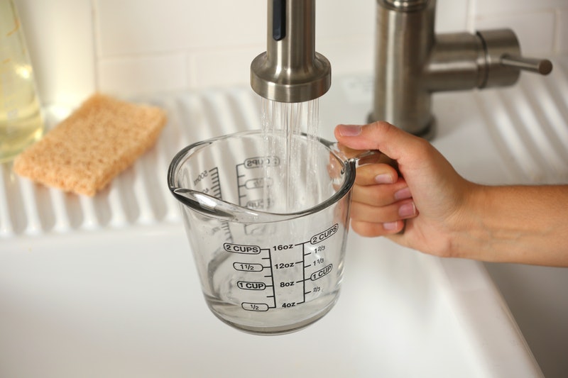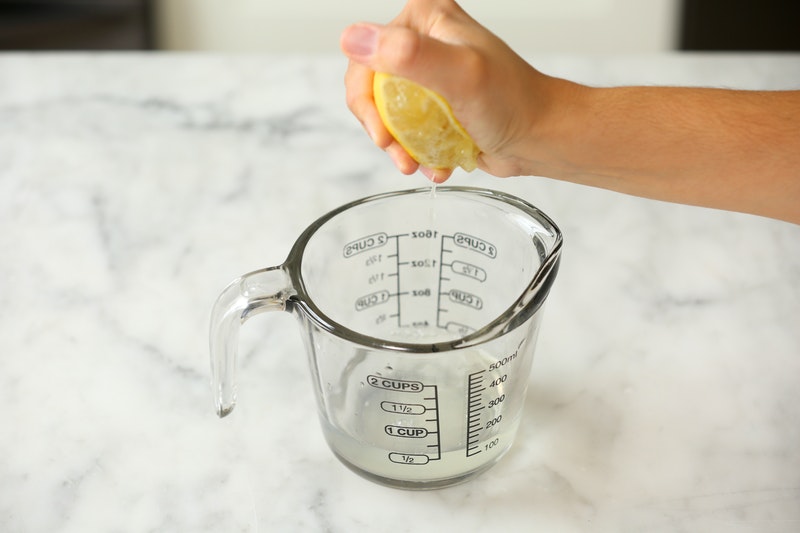 Đầu tiên, đong ½ bát nước sạch, sau đó cắt đôi quả chanh và vắt vào trong bát nước. Nhớ cho luôn phần vỏ chanh vào trong bát.