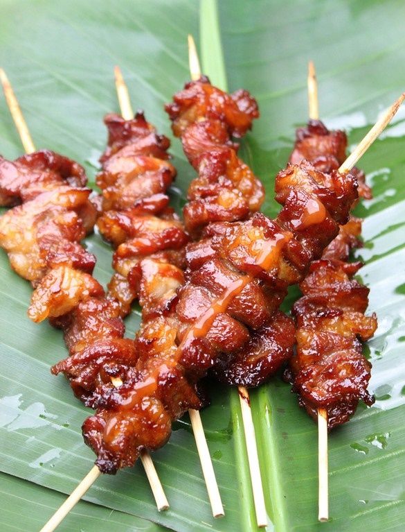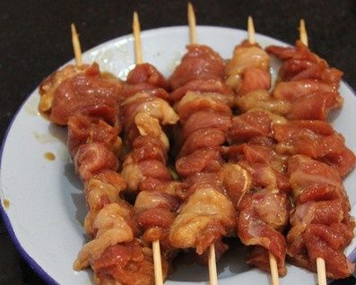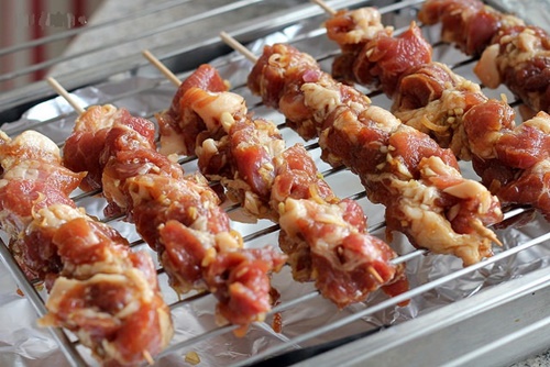 - Dùng que tre để xiên thịt. Lưu ý đừng xiên thịt quá dày để thịt chín đều nha.