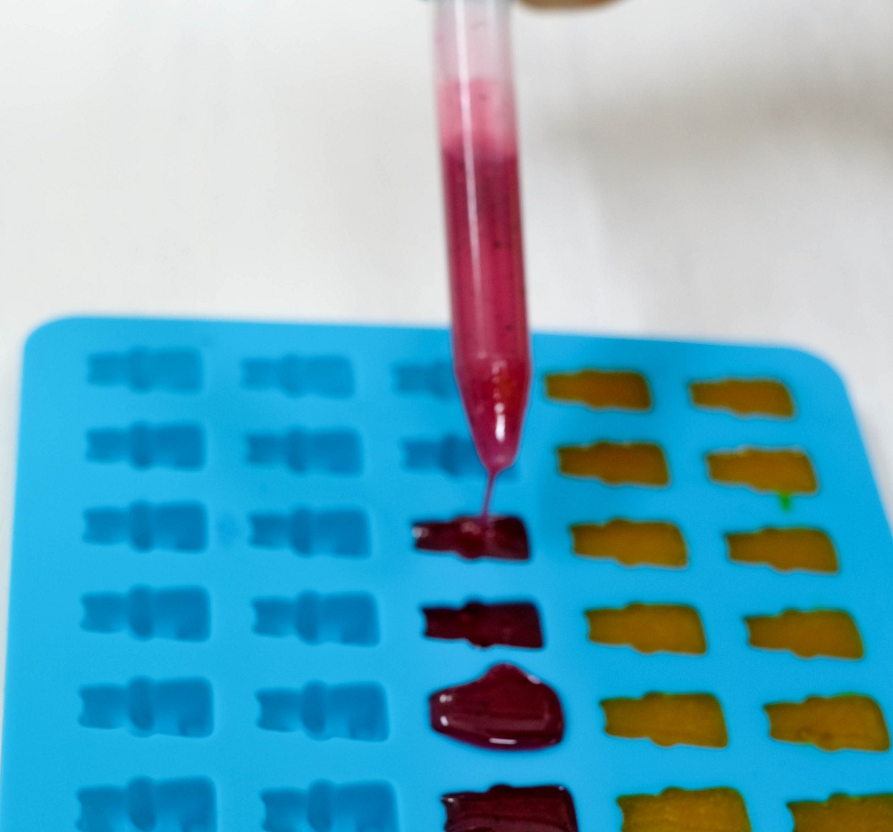 Bước 3: Vì sau khi hòa tan gelatin sẽ nhanh chóng đặc quánh lại nên bạn cần nhanh chóng dùng ống hút để cho hỗn hợp vào khay tạo hình.