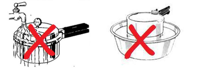 Giảm áp bằng cách bắc nồi áp suất xuống bếp rồi đưa trực tiếp vào vòi nước lạnh hay nhúng nồi xuống bồn nước lạnh đều có thể gây nguy hiểm cho người sử dụng. Nước có thể làm nghẽn van xả áp, có thể bốc hơi gây bỏng, nhiệt độ thay đổi đột ngột cũng có thể làm biến dạng lớp kim loại của nồi, do đó bạn không nên dùng các cách này để mở nồi áp suất.